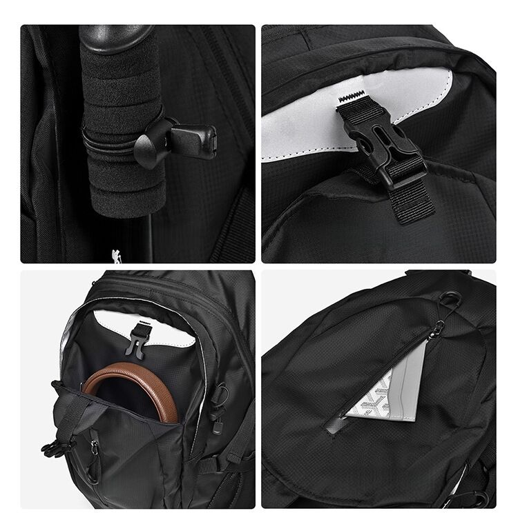 Multi-Compartment Design: The entire backpack is designed with multiple compartments, including a main compartment, front U-shaped opening pocket, side elastic mesh pockets, and several independent functional pockets.