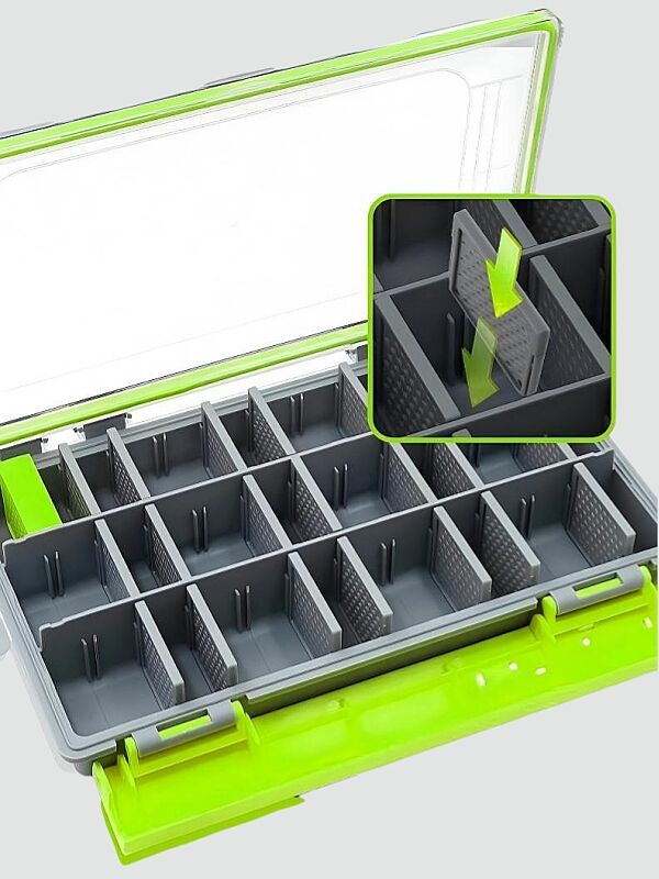 Innovative, movable divider panels inside the box allow free customization of the layout to fit different tackle sizes: